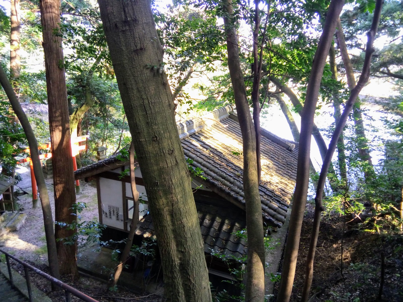 . . . . Morihachimangu-jinja Shrine. Taking a look at the Torii and Shrine, I got the feeling they had recently been repainted. In the past I have used this site to take-a-break and have a bite-to-eat but, as it was sheltered by many tall trees & dense bush, it was too cold.